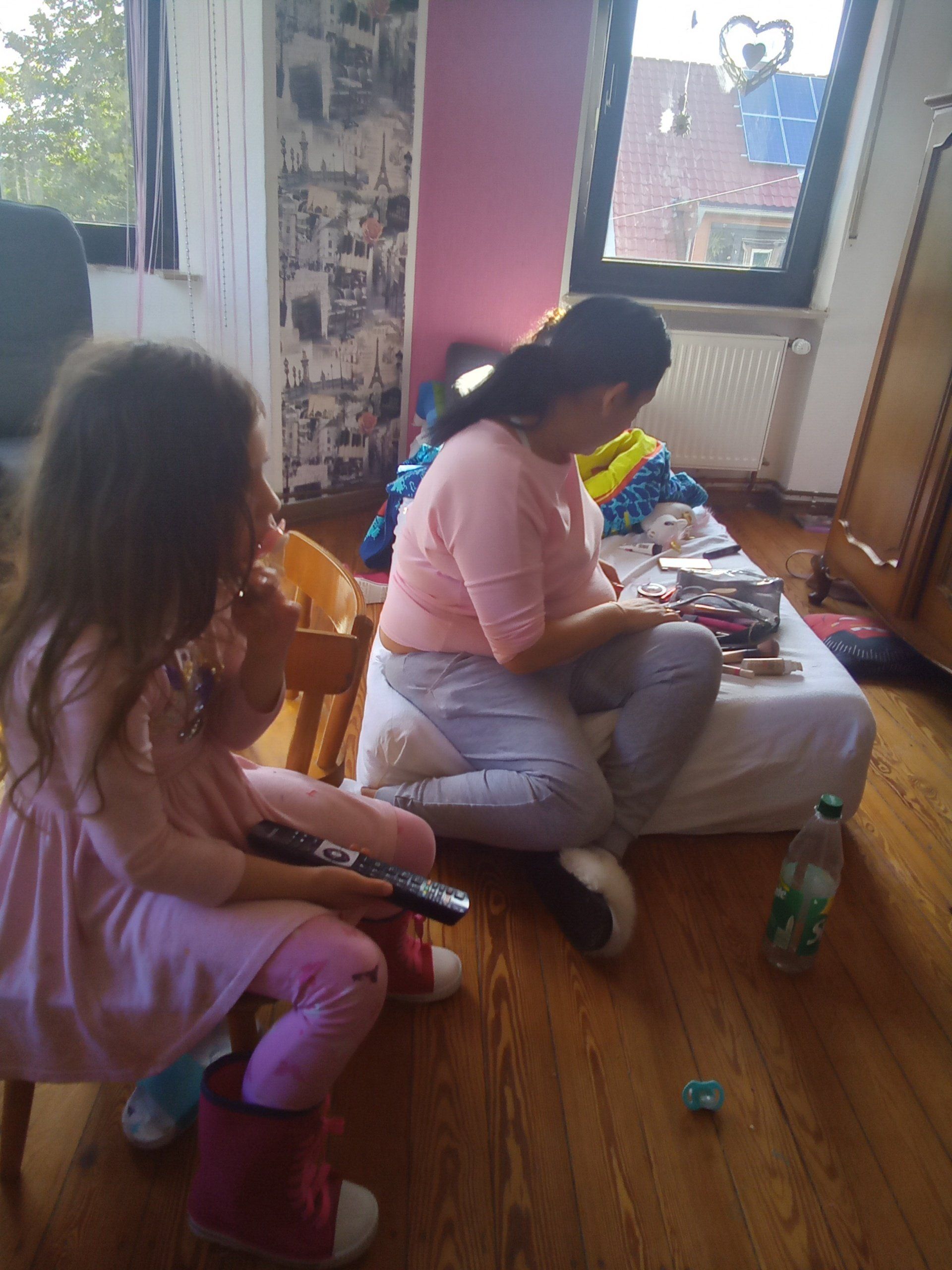 Wir sehen hier zwei Zigeunerinnen bei einer Übersprunghandlung. Tünde Farkasova schminkt sich und ihre Tochter schaltet den Fernseher ein denn dort gibt es bestimmt etwas Spannendes.