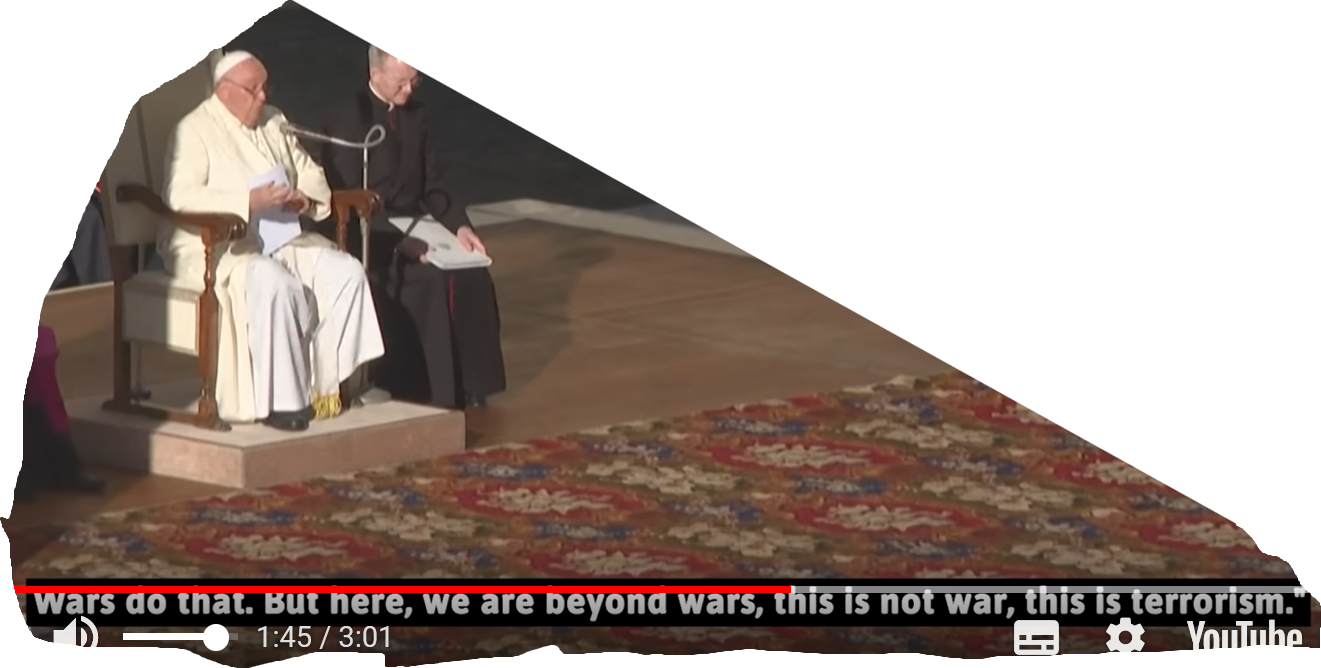 Ich persönlich bin der festen Überzeugung, das Papst Franziskus die Zeichen der Zeit erkannt hat. Das die Welt auf ein großes kriegerisches Debakel hinsteuert. Er propagiert seine Meinung, die in vielen Punkten die meine ist. Viel Punkte würde ich warscheinlich anders formulieren, und in Deutschland damit Schwierigkeiten bekommen. Aber warum sollte ich das tun. Um mich gegen den Papst zu profilieren ? Wer mit /0 jahren och kein Profil hat der wird auch den Rest seines Lebens keins bekommen. So legen wir uns in den Windschatten des Papstes und uterstützen den Papst